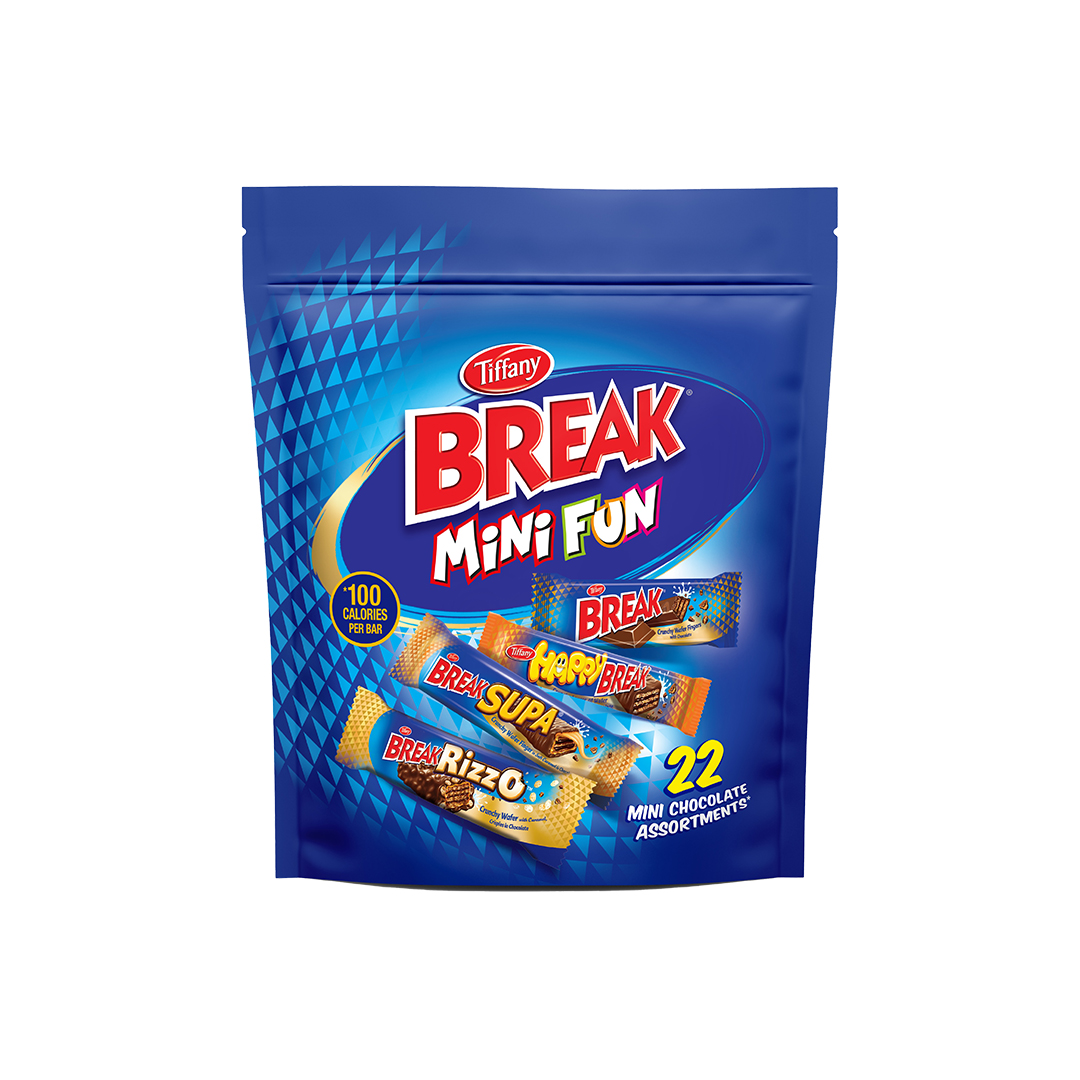 Description Description Tiffany Break Mini-Fun 22 Mini chocolate assortments includes Break, Happy Break, Supa and Rizzo 316 g Related products ConfectioneryBebeto spaghetti Apple Read more ConfectioneryTiffany Delights 405gm Read more ConfectioneryBebete Gummy Candy Grape Read more